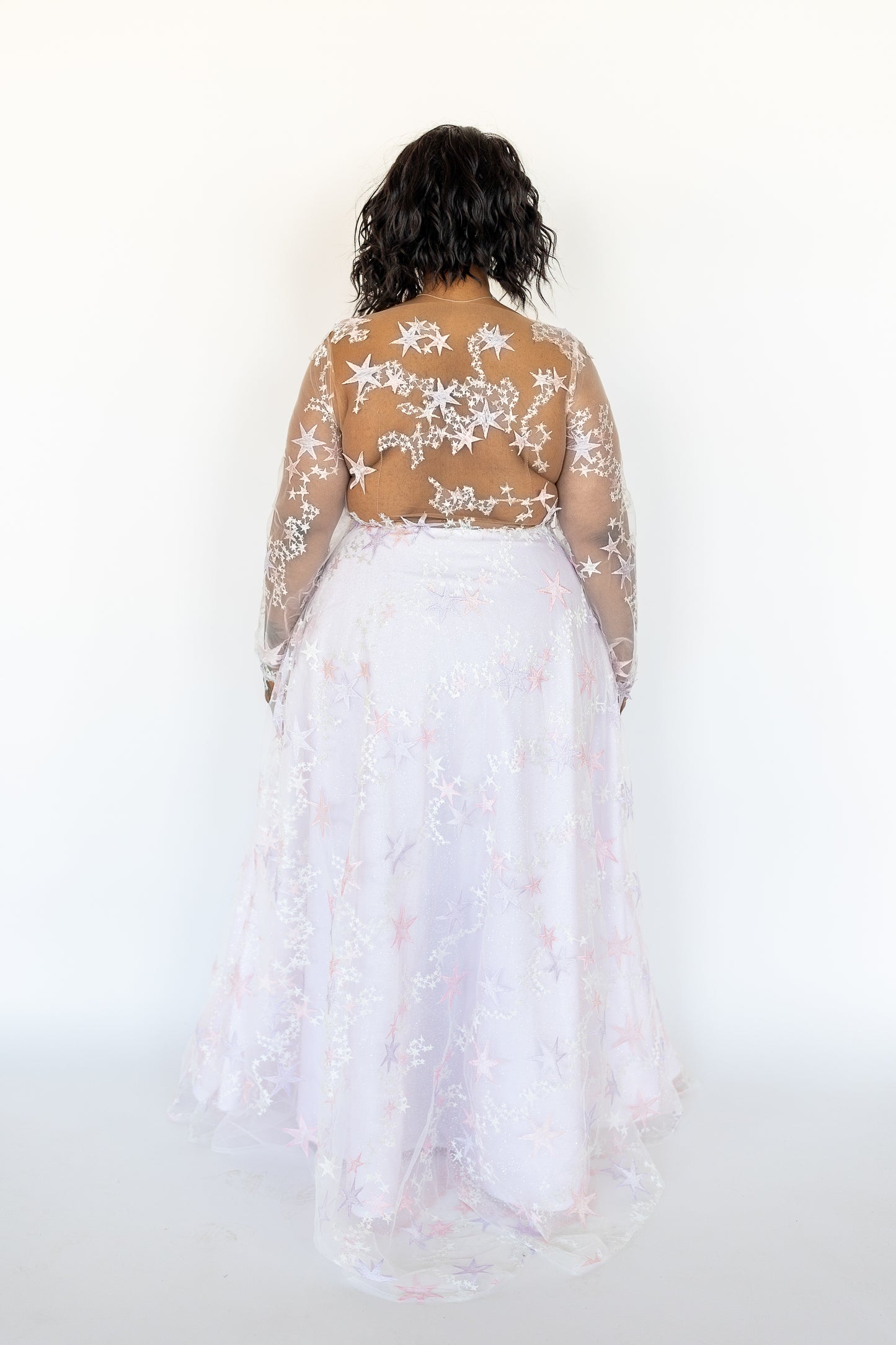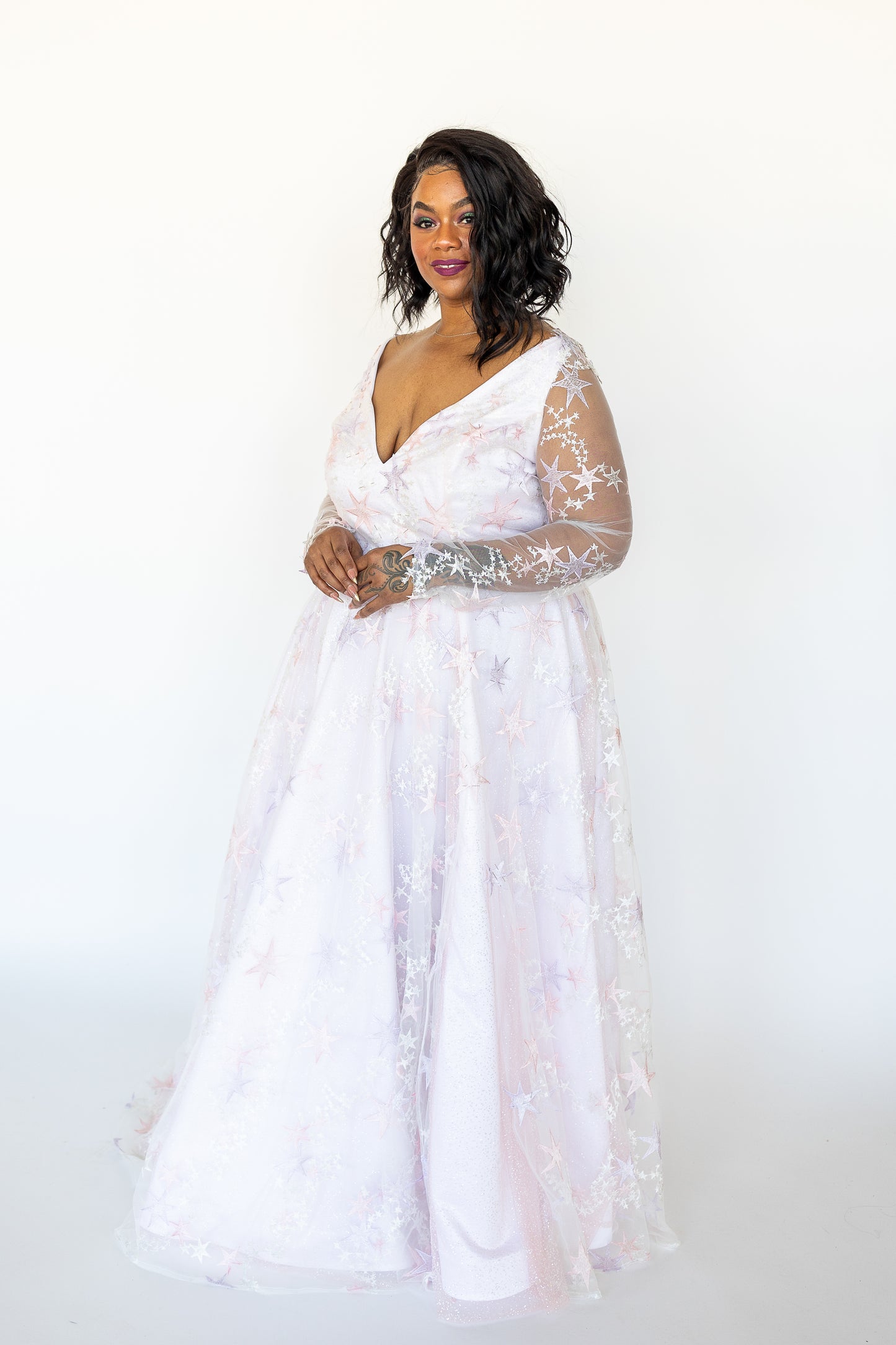 Shown in off-white with lavender and blush star mesh/blush glitter tulle/white satin/Virgo constellation/long sleeve/no lining in back/slit/small train.