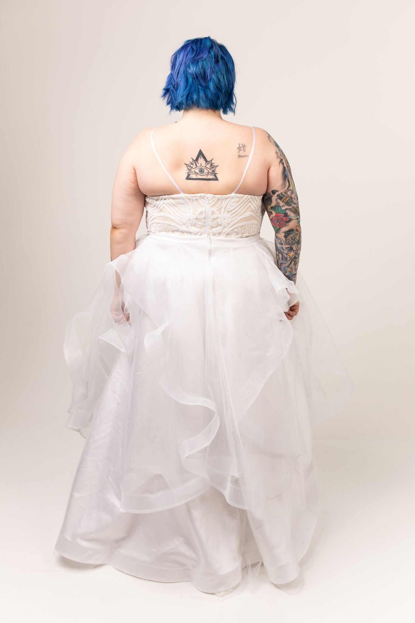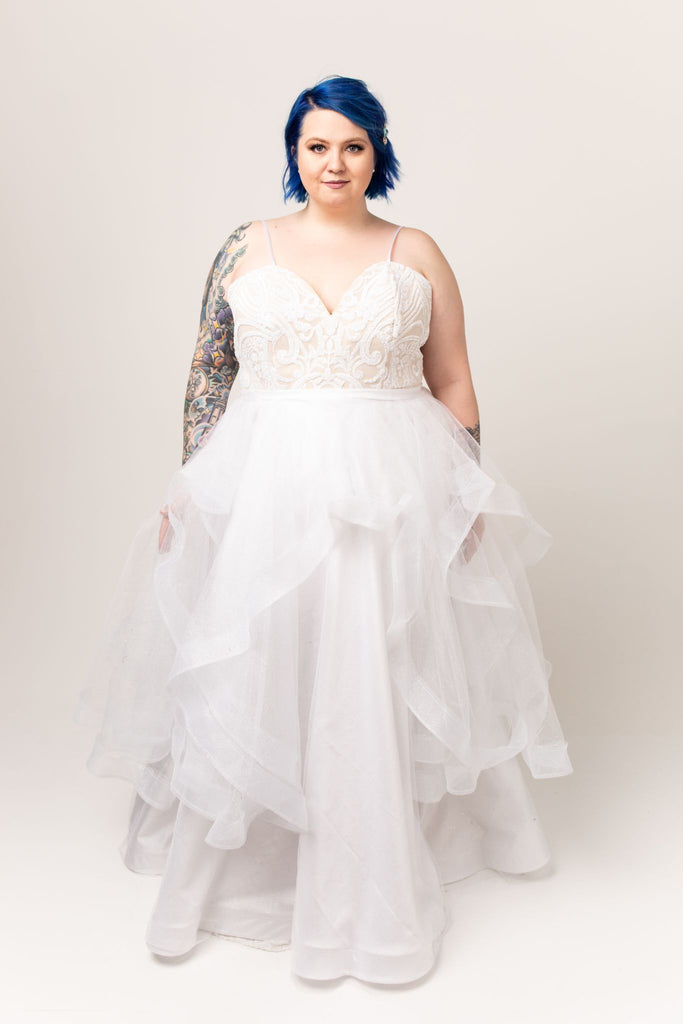 The Cierra Gown with Cascading Glitter Tulle Skirt is an even more sparkly and dramatic version of our popular Cierra Gown, perfect for brides wanting to make a statement!