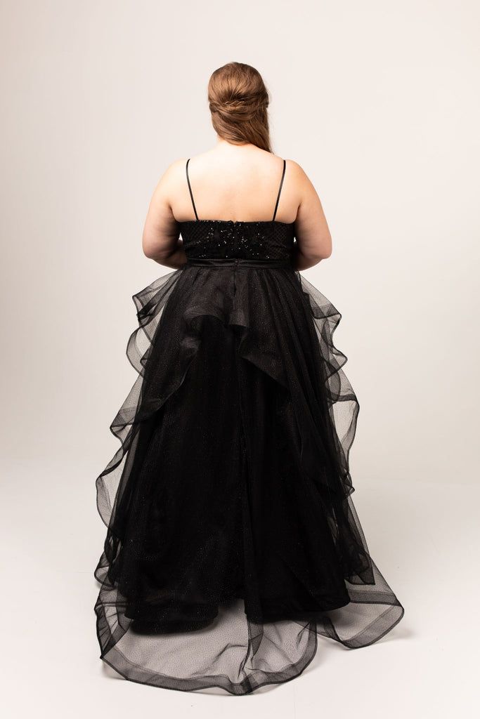 - Dramatic glitter tulle ballgown skirt with cascading ruffles, hemmed with stiffening horsehair for added fullness; lined with a matte satin circle skirt