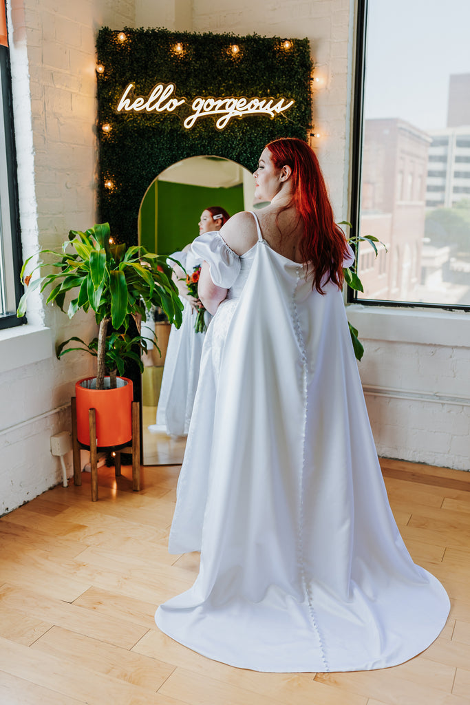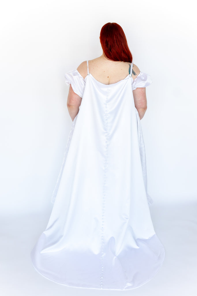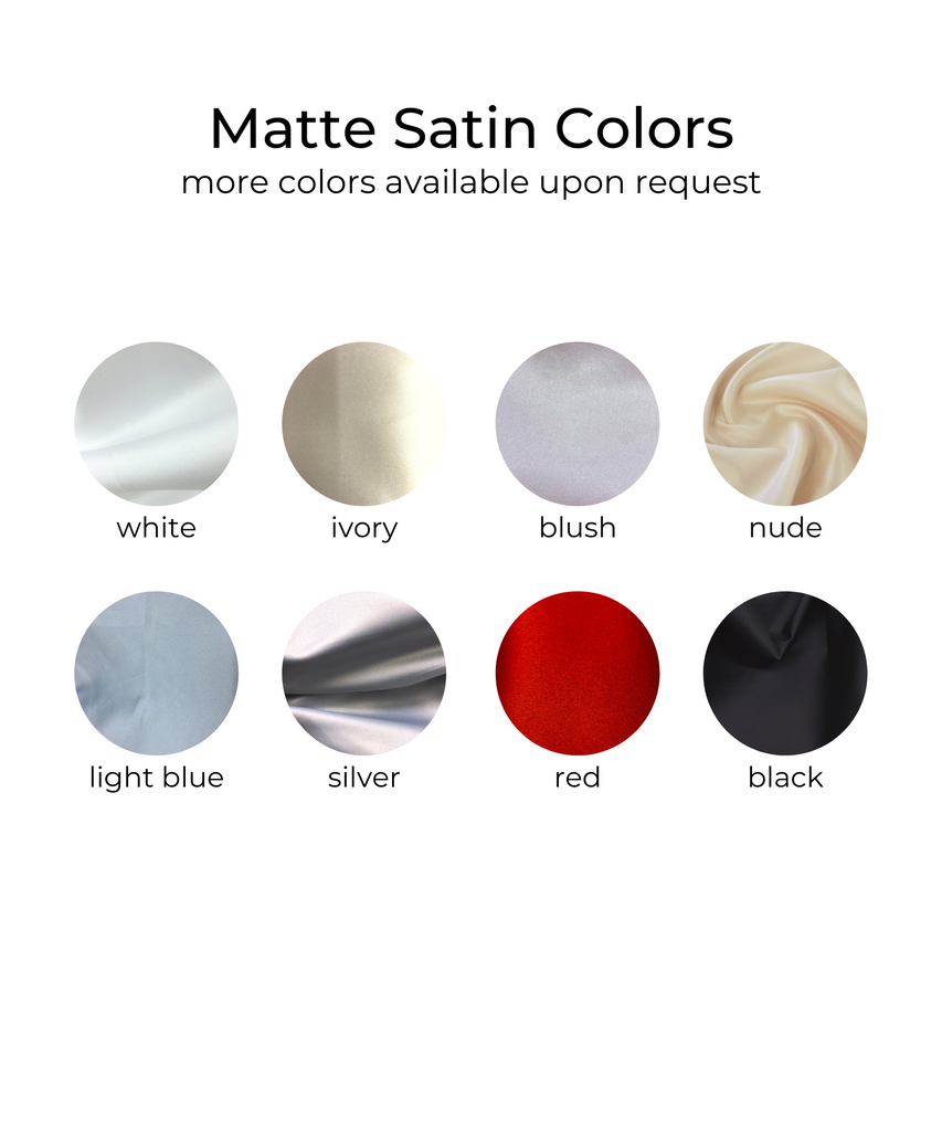Our Detachable Satin Watteau Train is an easy way to add elegance and drama to your wedding gown! Use this as a detachable train to create drama in your wedding portraits and when you walk down the aisle, then remove it easily for your reception. Pair with our Satin Puff Sleeves for even more drama!