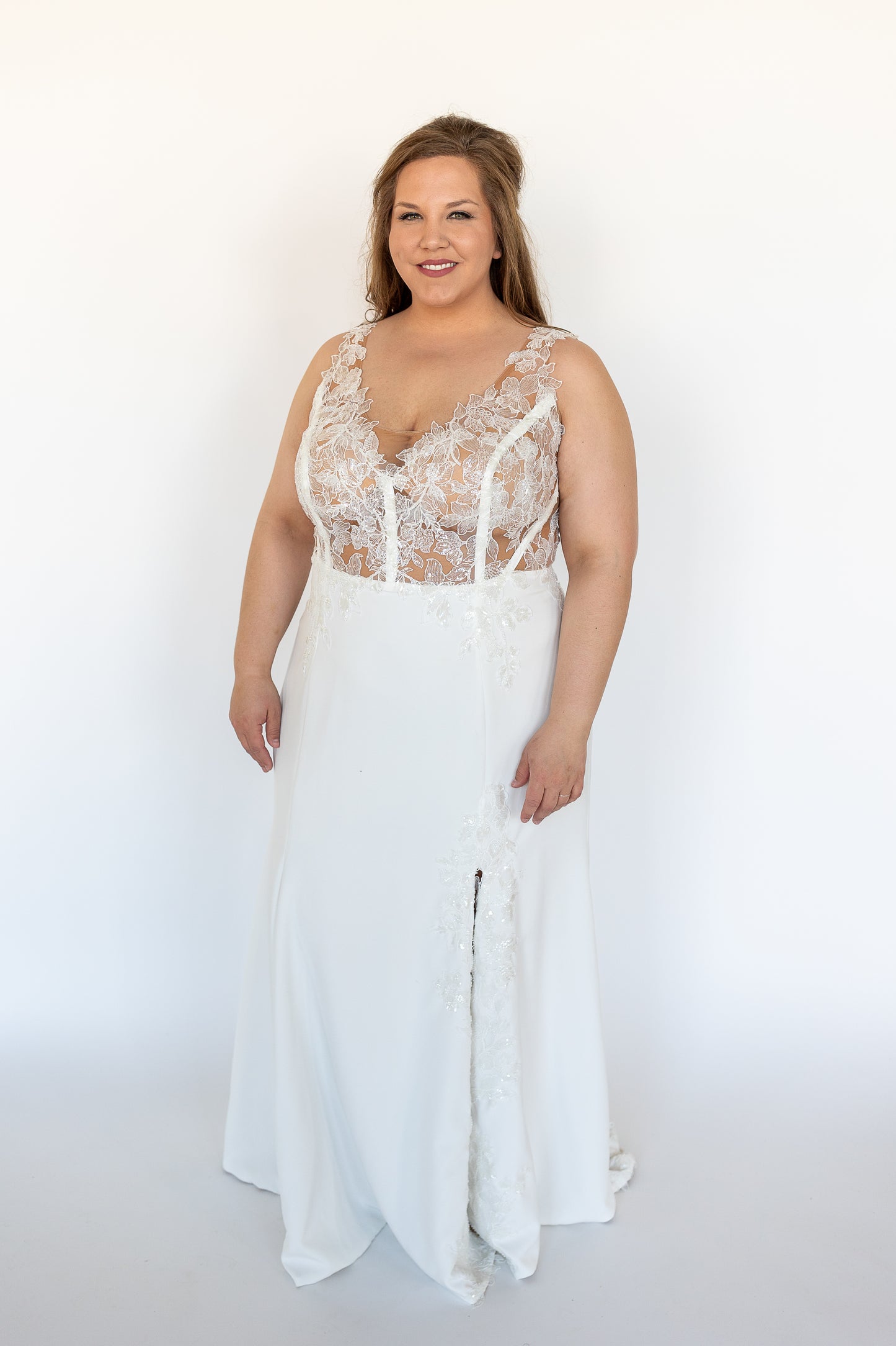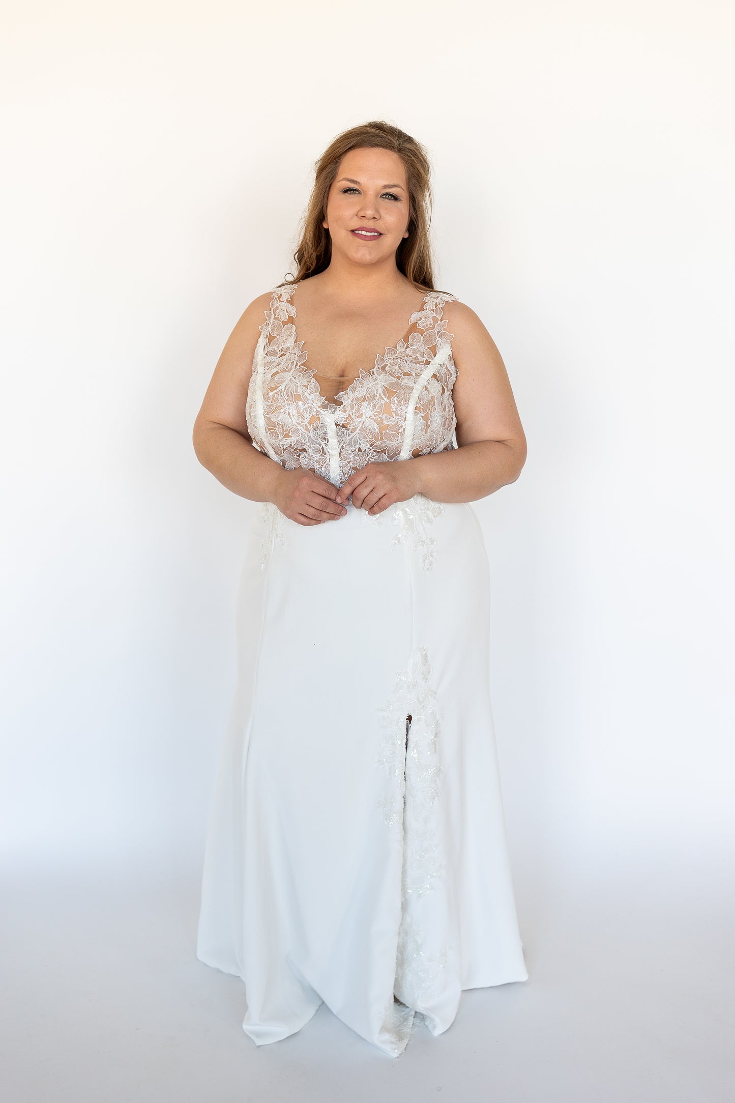 Shown with off-white applique/ivory stretch crepe/universal tan mesh/sleeveless/no bodice lining/slit/small train. Please note: the original sequin applique used in this style is no longer available. Please contact us to see alternative applique options prior to ordering this gown.