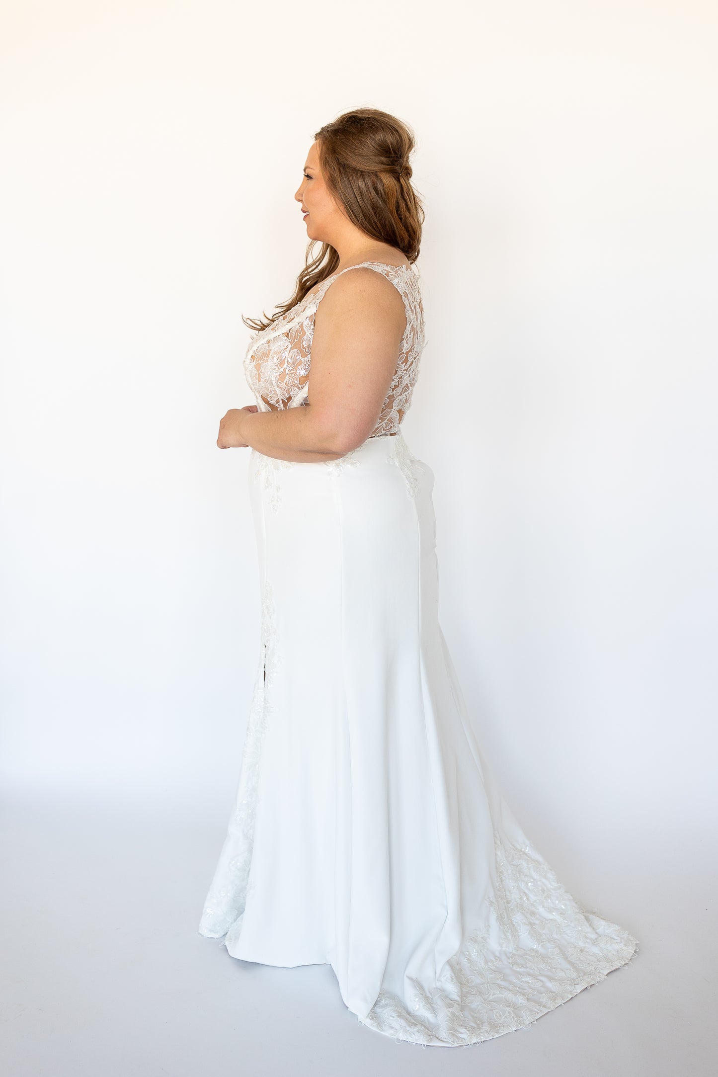 - Stretch crepe mermaid skirt with optional slit; lace appliques frame both sides of the slit