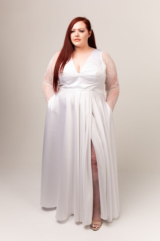 A more formal version of our popular Nora Gown, this modern satin and lace gown has all the elements to make you feel powerful, glamorous, and confident on your wedding day. And then we added pockets.