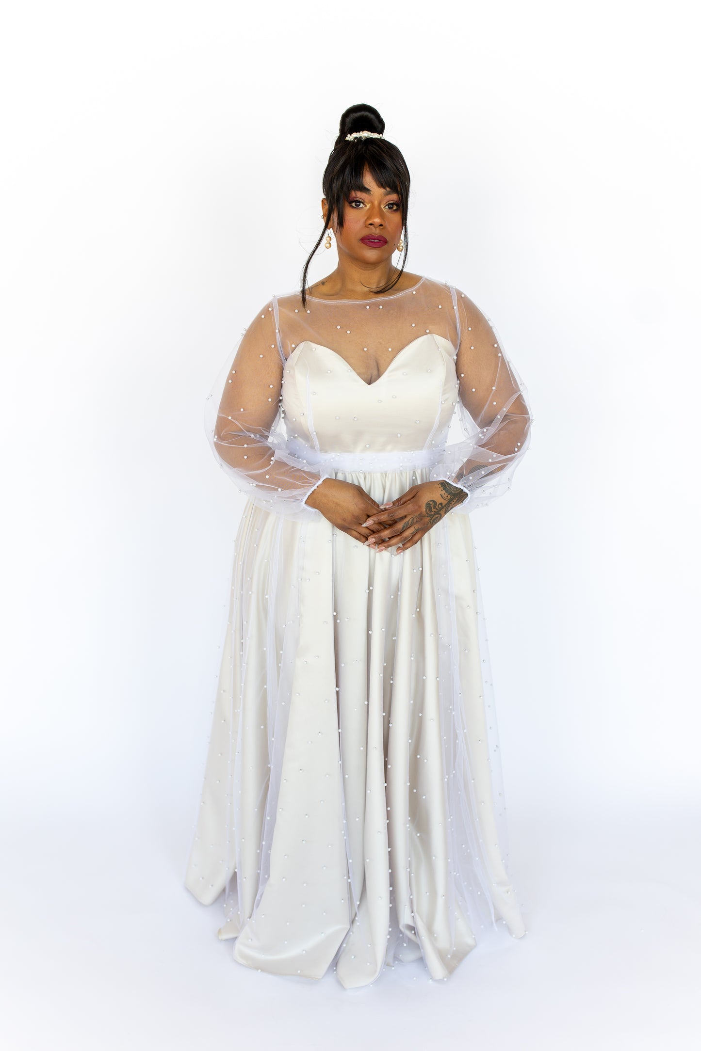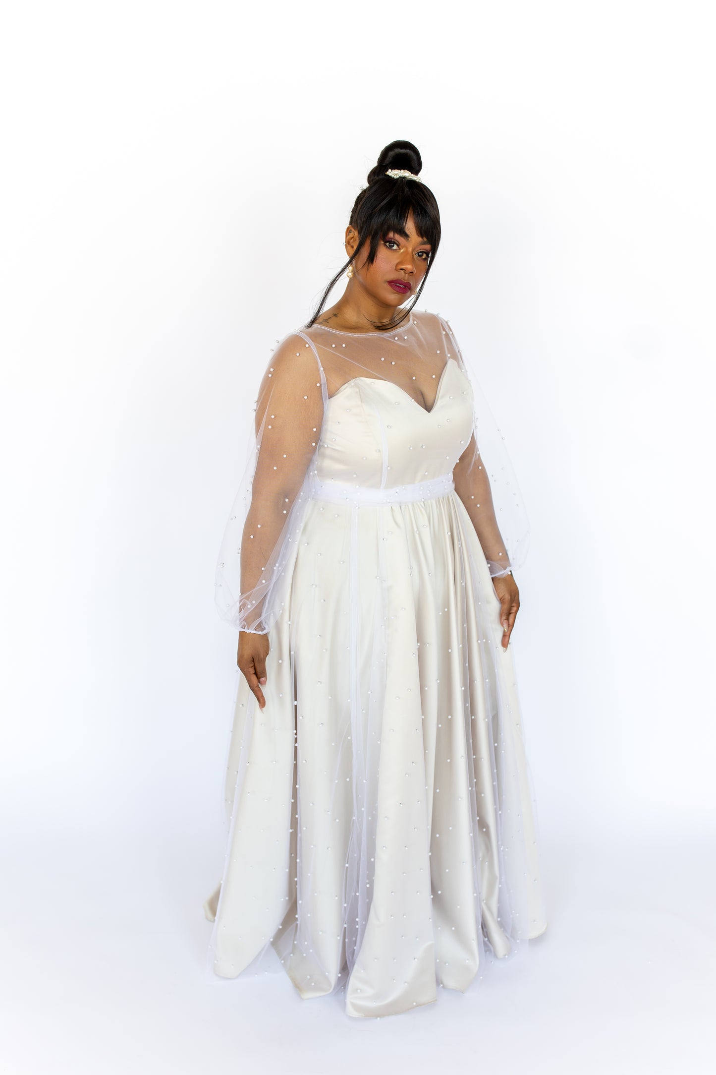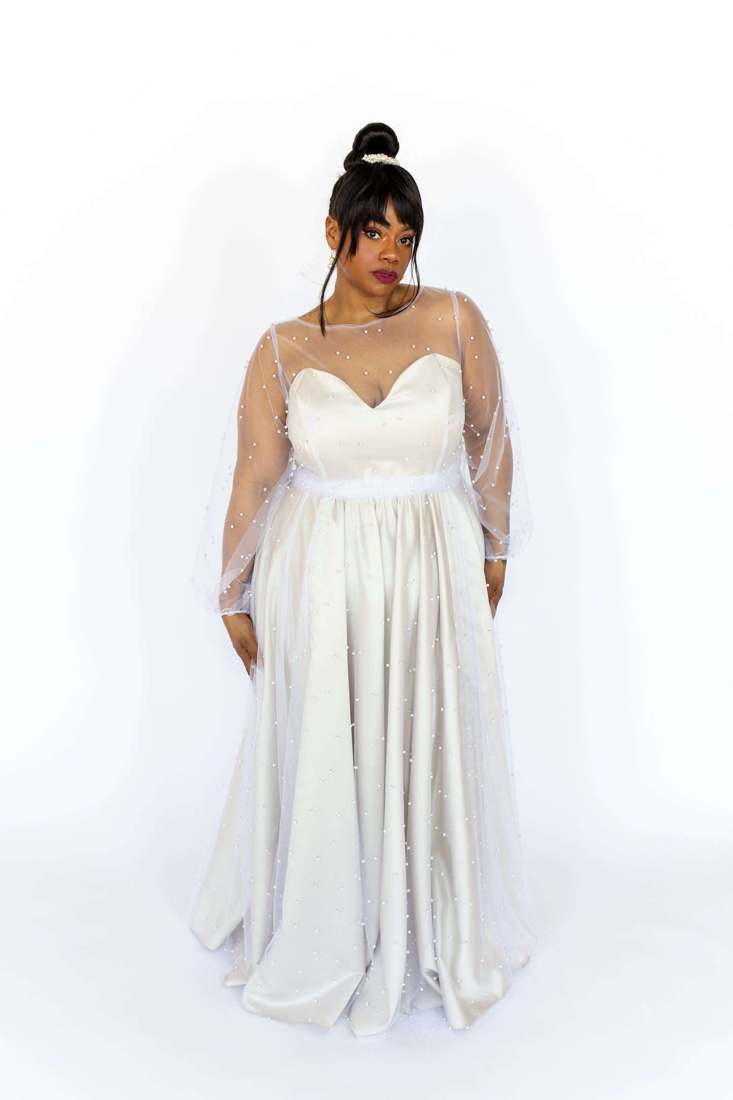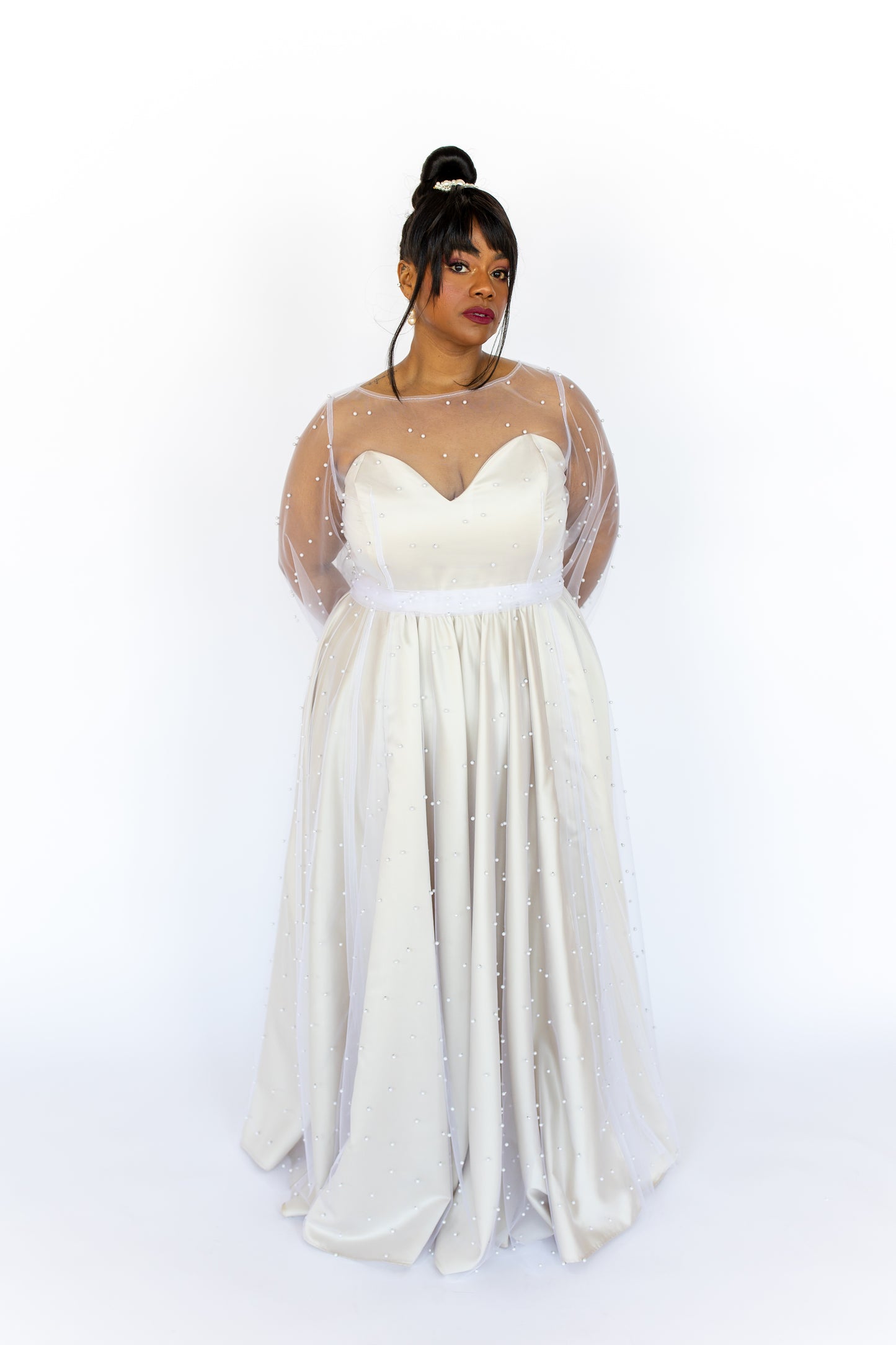 Our Portia Pearl Overlay is a great way to add a modern, glam twist to your wedding day look! Shown here with our Grace Gown as a lining.