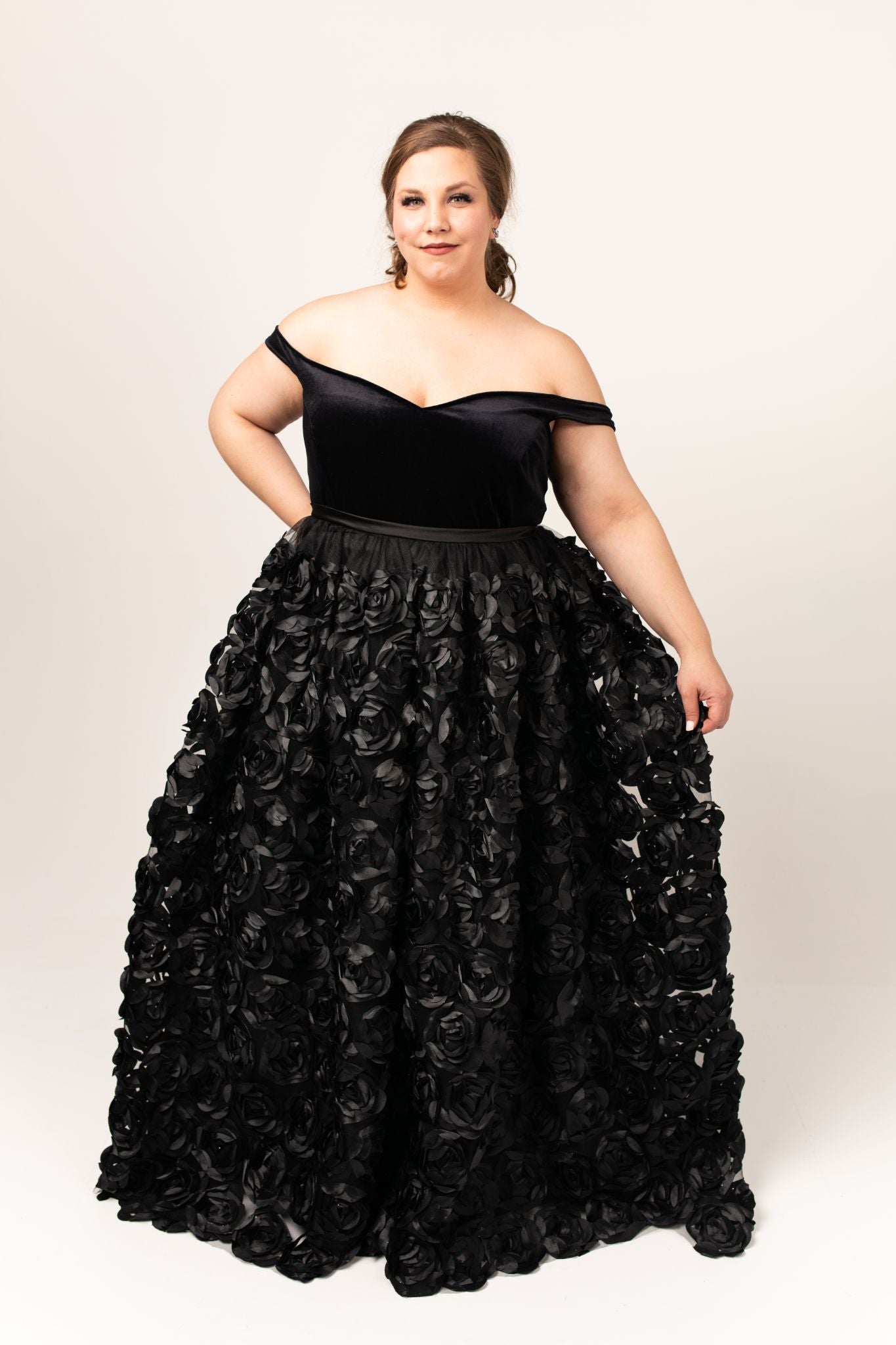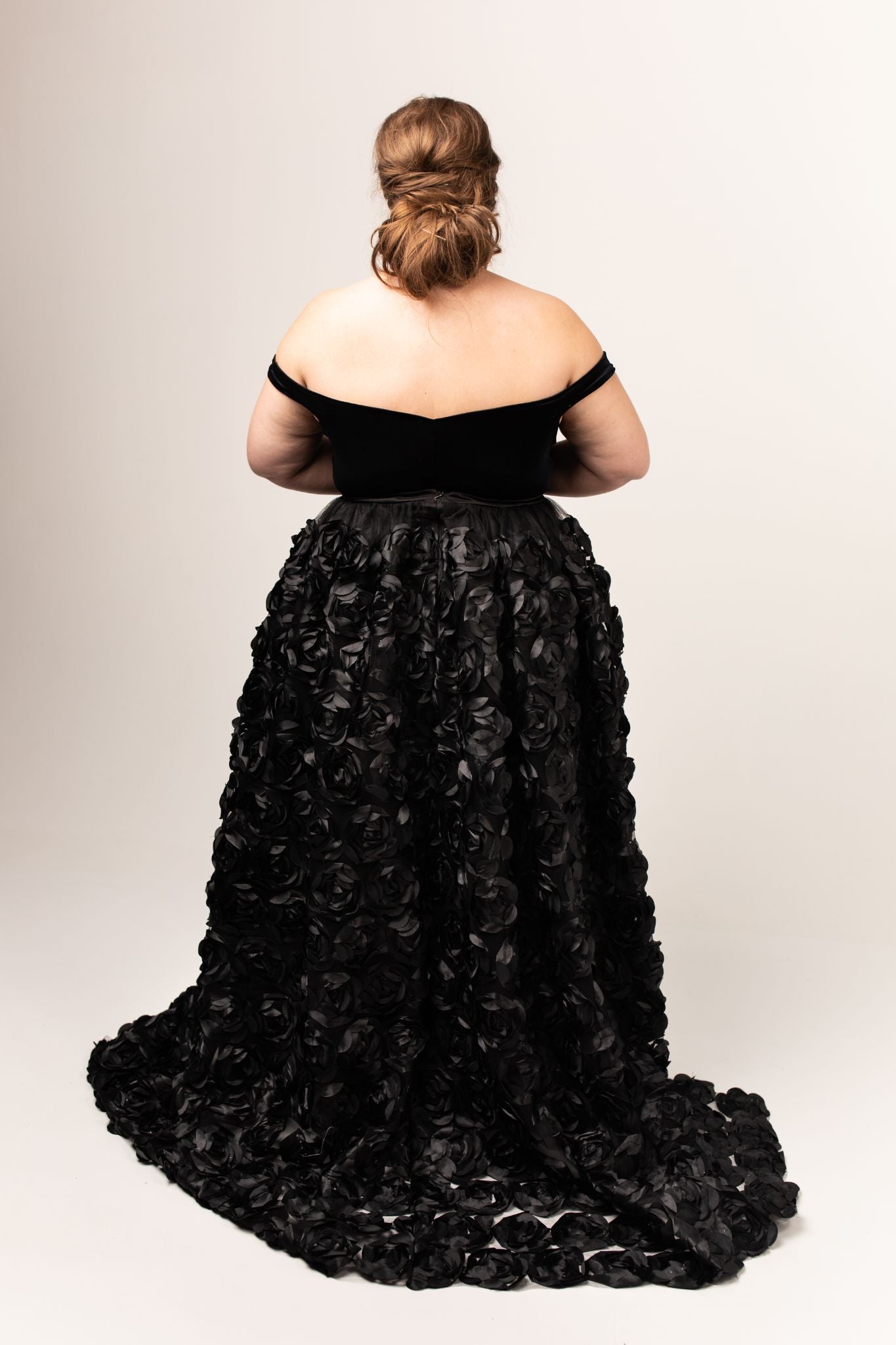 - Dramatic gathered satin rosette ballgown skirt (satin roses backed with mesh) with hand-cut satin rosettes along the hem; lined with a matte satin circle skirt