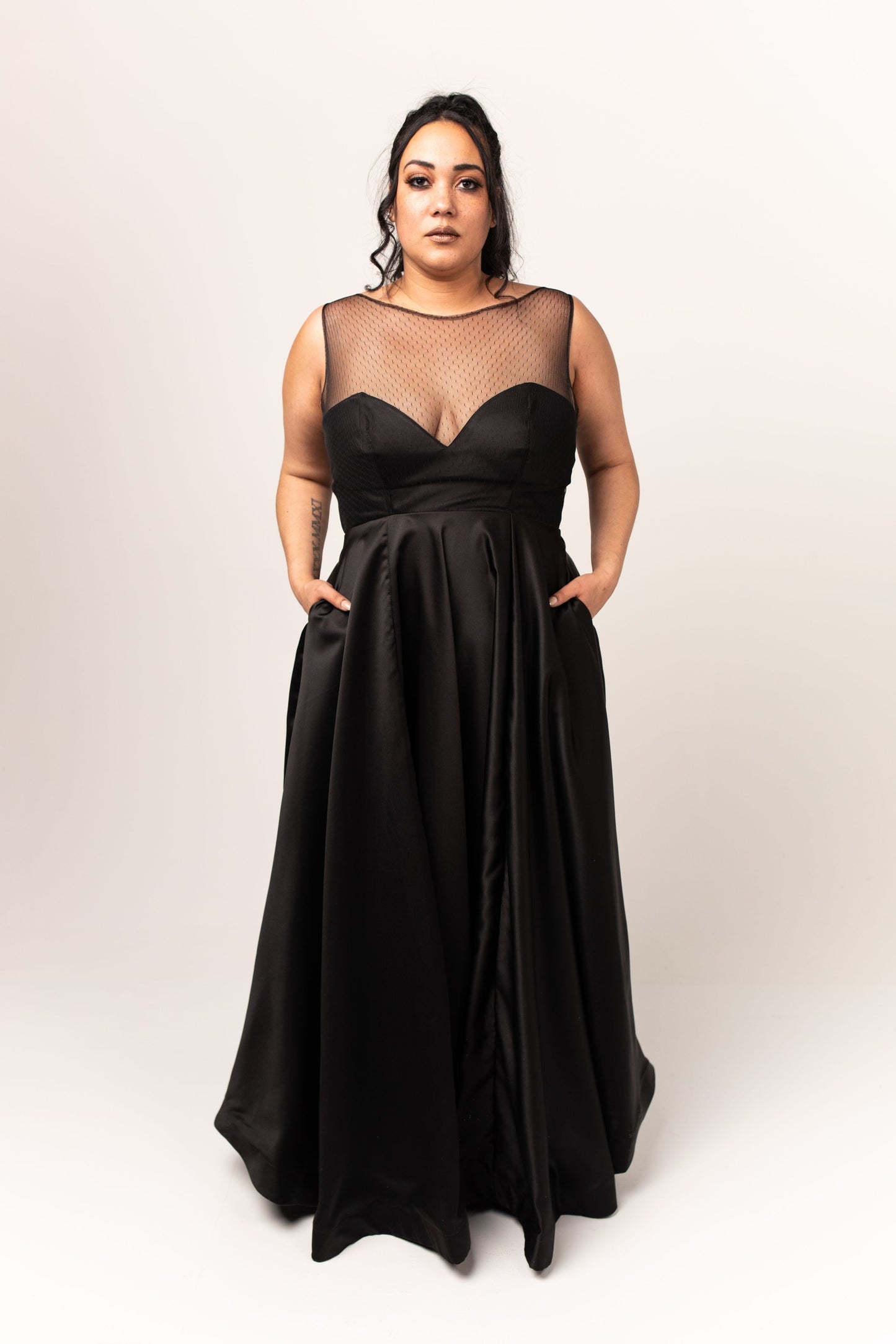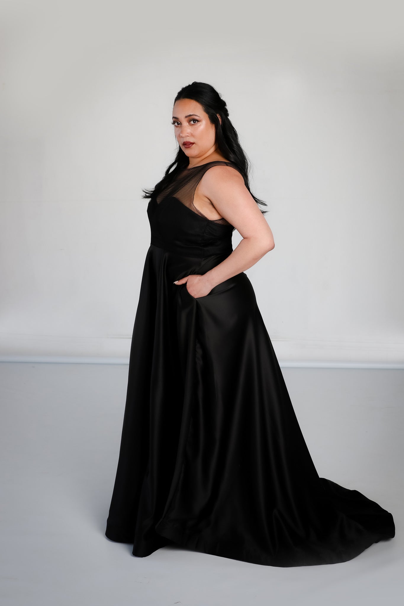 The Adelaide Gown combines the modern, romantic look of satin and point d'esprit lace with the convenience of pockets!