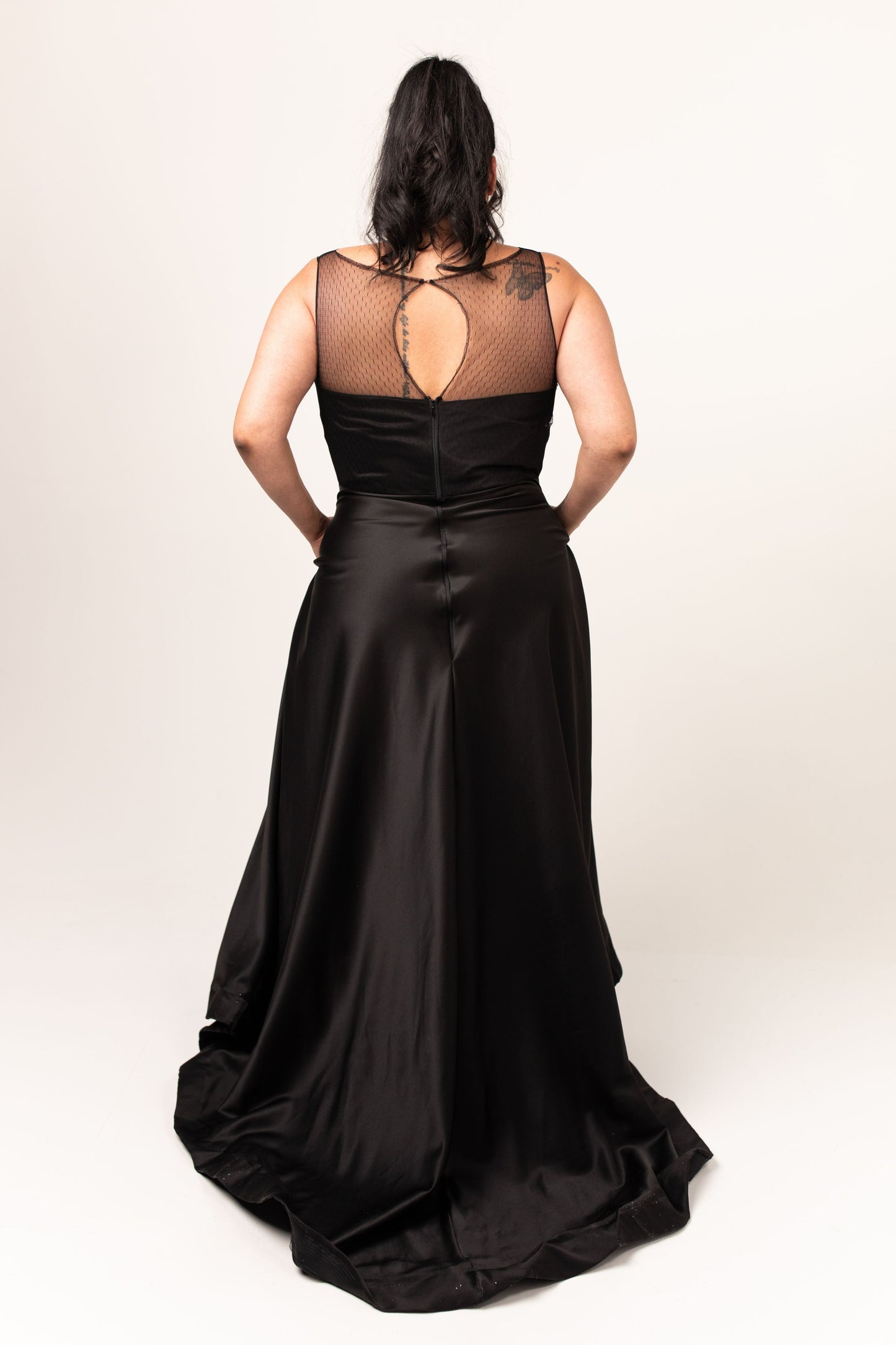 - High lace back with keyhole cutout, with a hook and eye closure at the top and center back zipper closure below the keyhole