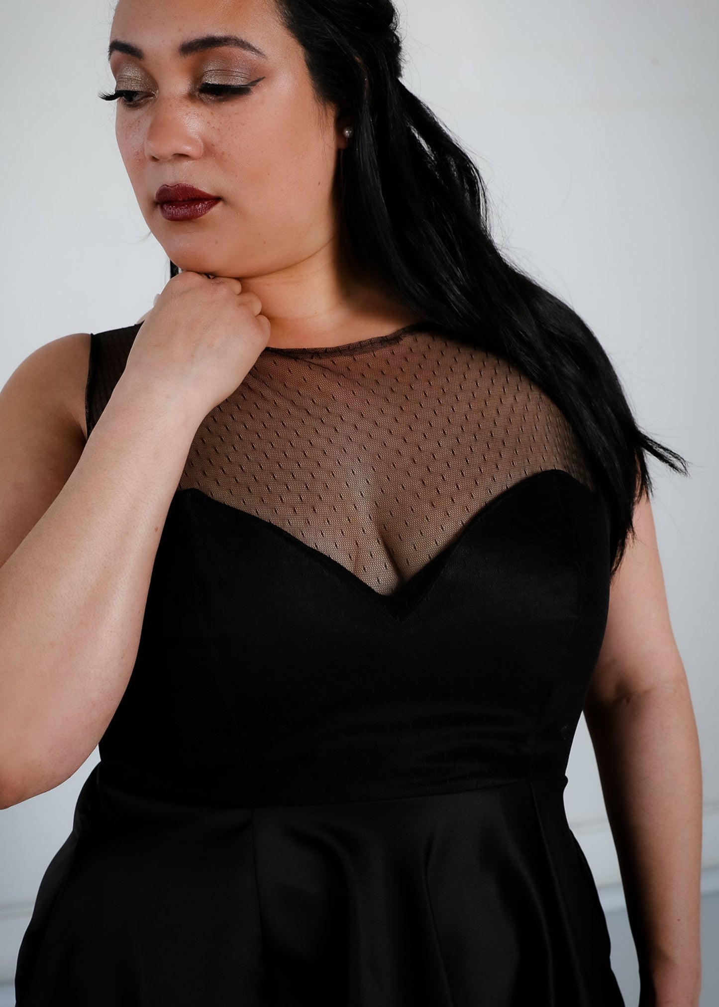 - High rounded neckline made from delicate and romantic point d'esprit (dotted) lace, lined with a matte satin sweetheart lining