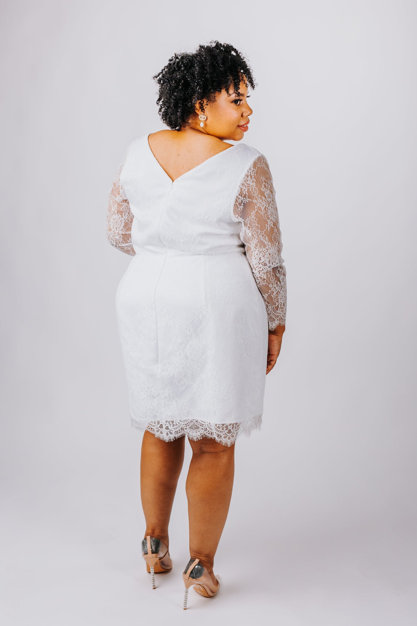 - Delicate chantilly lace fabric throughout, with elegant eyelash lace scalloped edges at the hem and sleeves