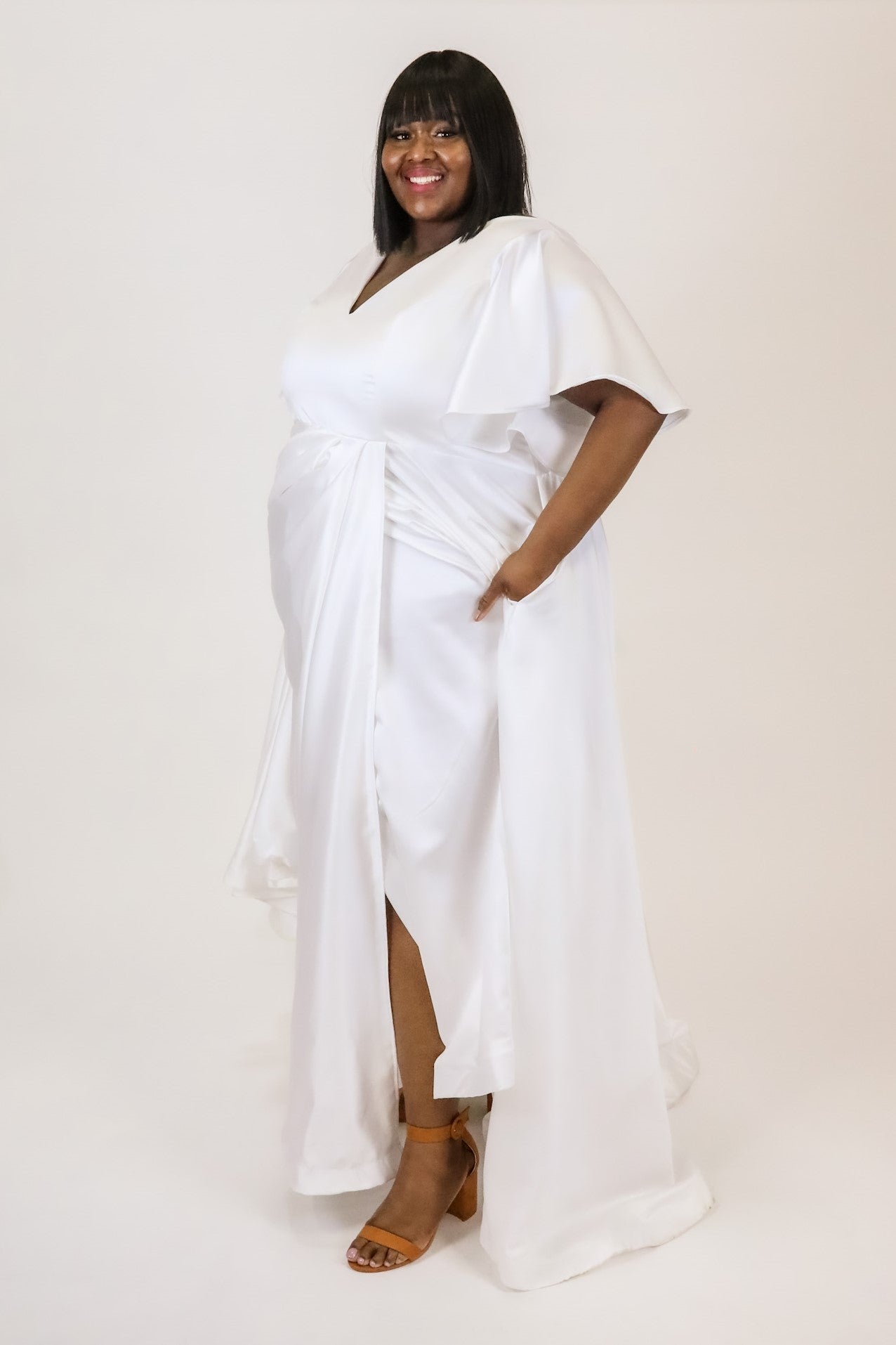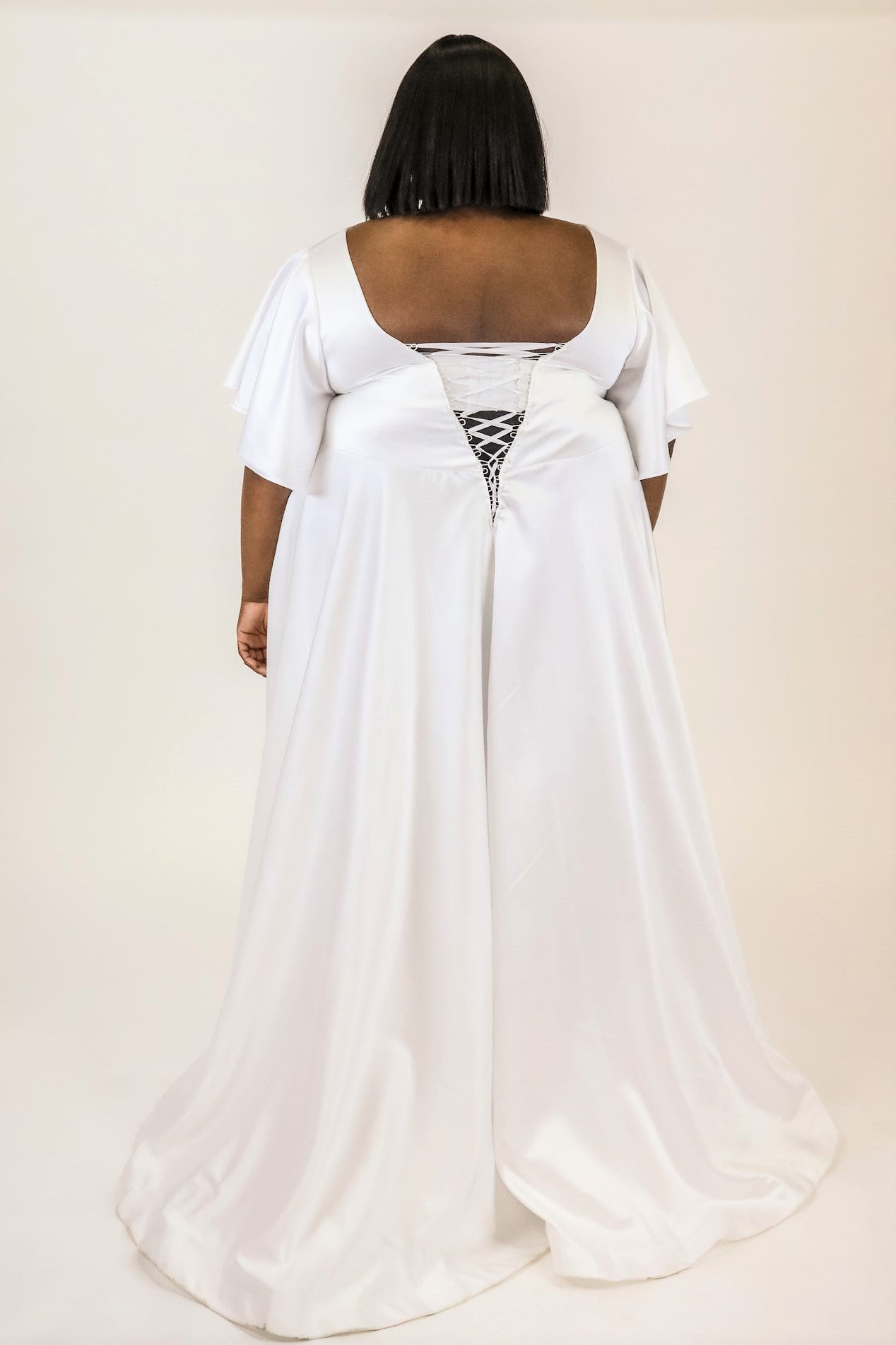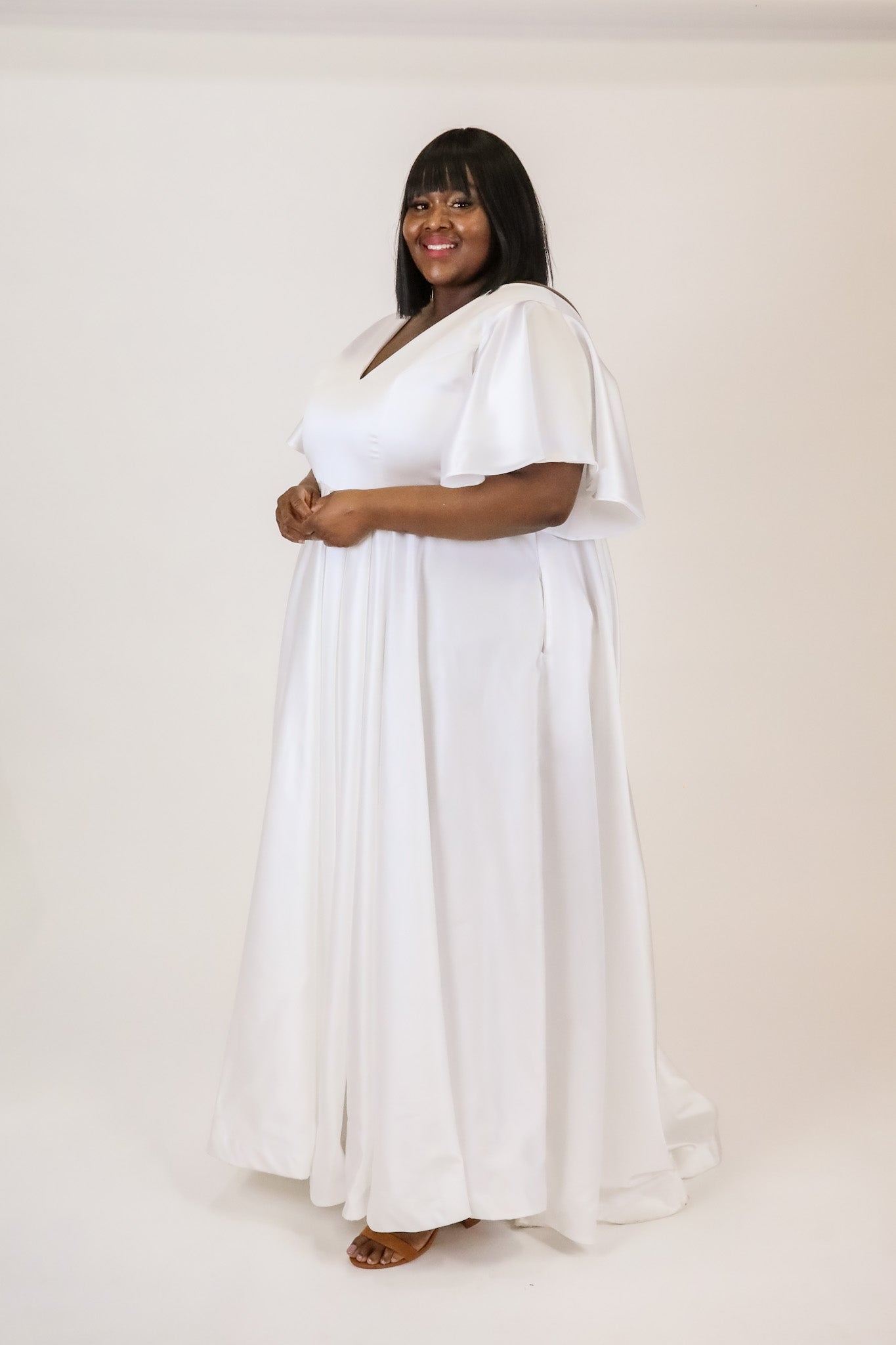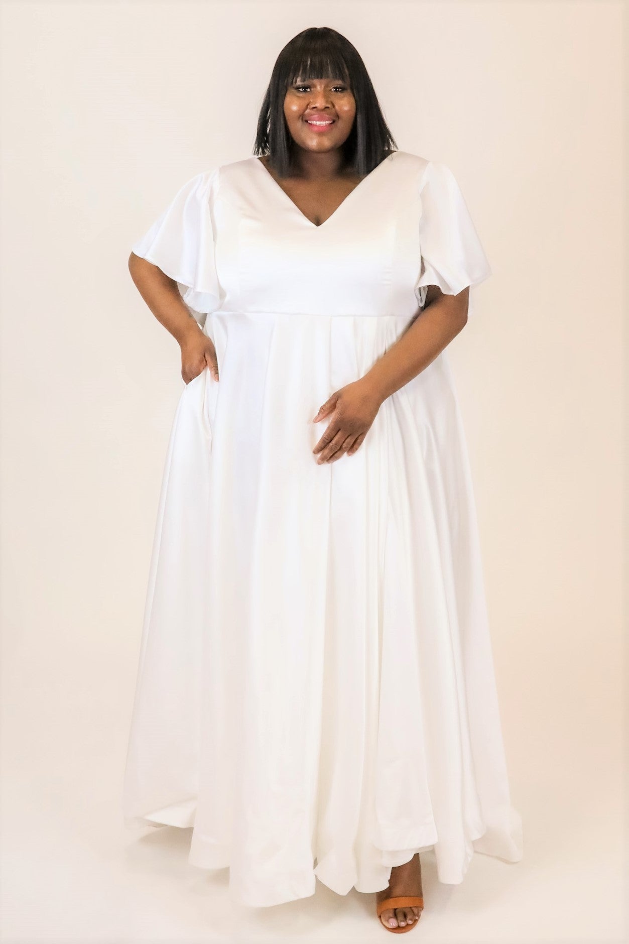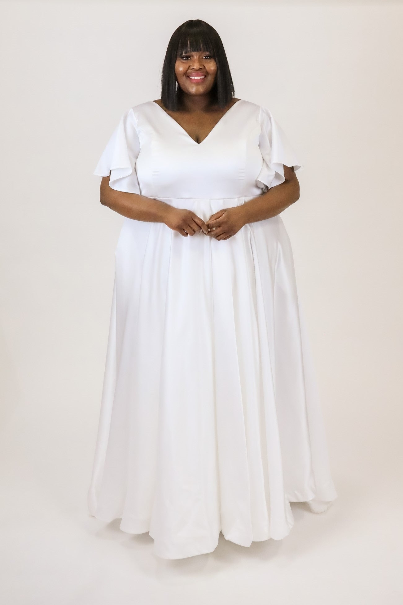 The white, size 24-28 sample of the Nora Gown with Flutter Sleeves features: