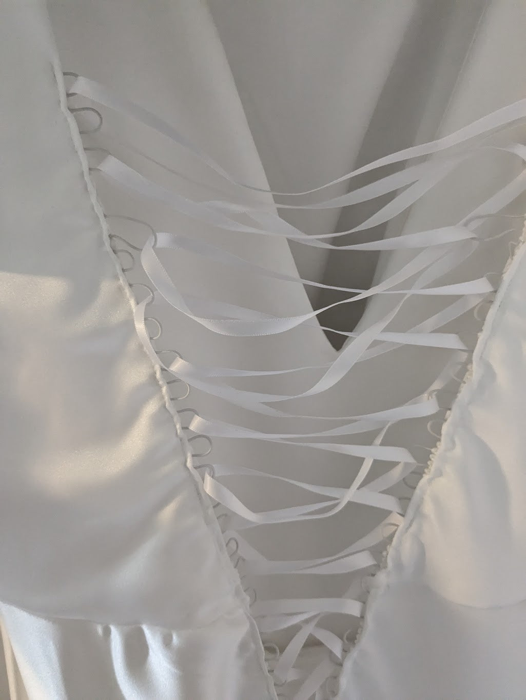 The condition of this sample is good, used condition (needs cleaning; recommended repair). There is staining along the hem that should be cleaned or hemmed shorter. We recommend the corset loops be replaced with stronger loops. See listing photos for close-up photos of any damages, stains or recommended areas for repair.