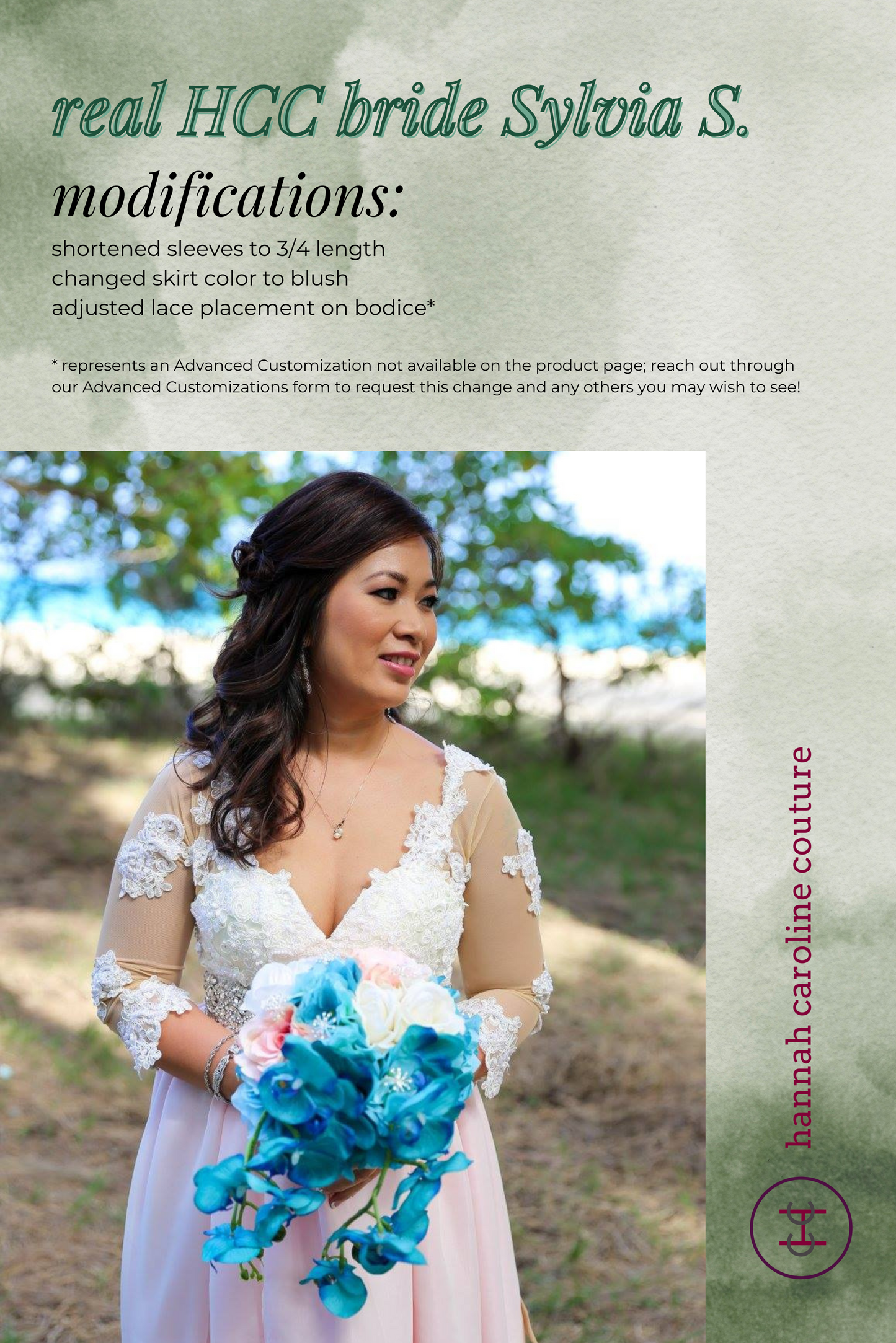 All Hannah Caroline Couture garments are made to your measurements and preferences. We have no standard size chart, and we offer free custom sizing always. All sizes and measurements are welcome. After your order is placed, the designer will email you with a link to schedule a free 15-minute video call to take the specific measurements we'll need. These video calls help to ensure sizing accuracy, minimize your alterations costs, and give you a chance to meet + chat with the person who will be making your dress. While custom sizing drastically reduces your alterations costs, some alterations may still be necessary.