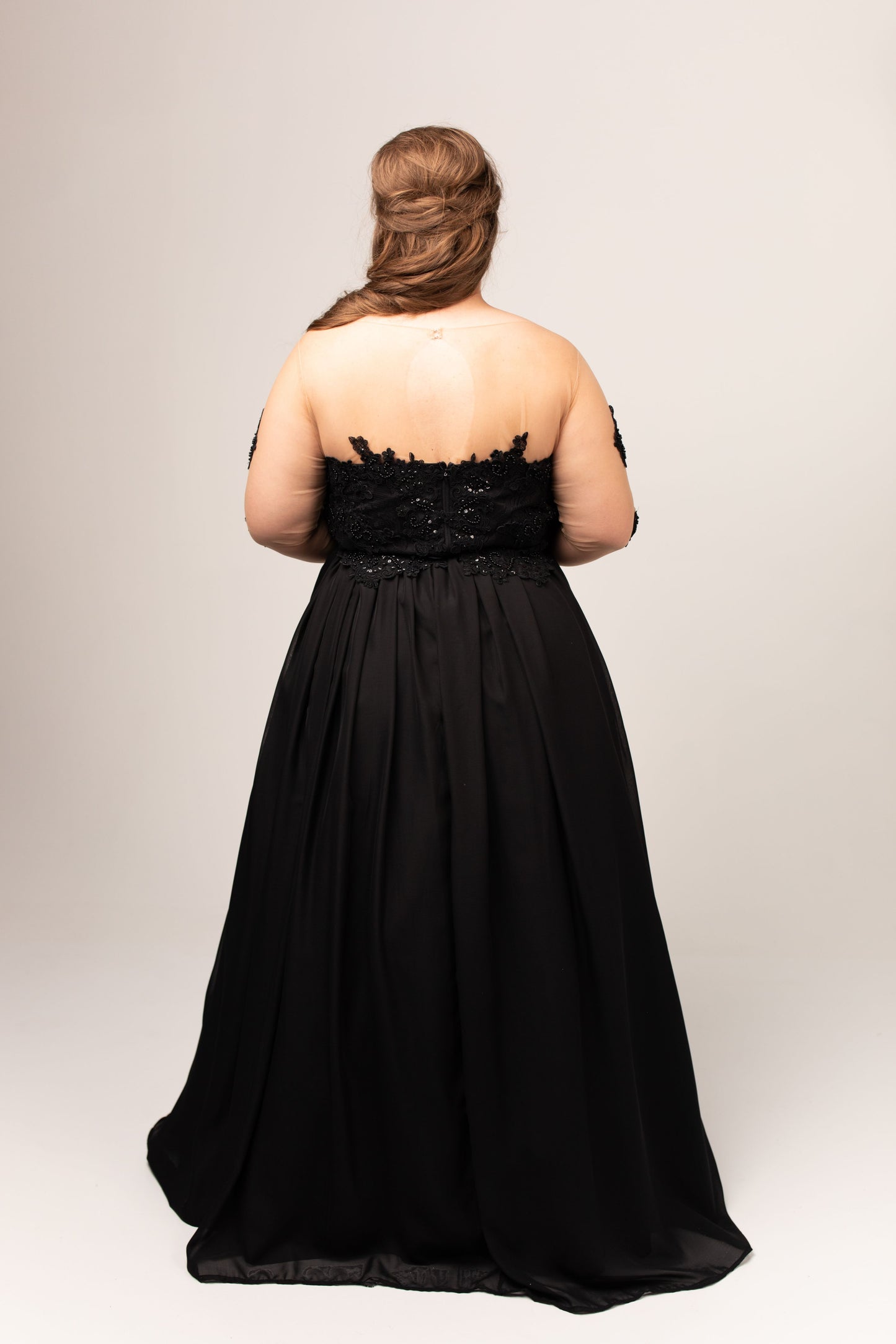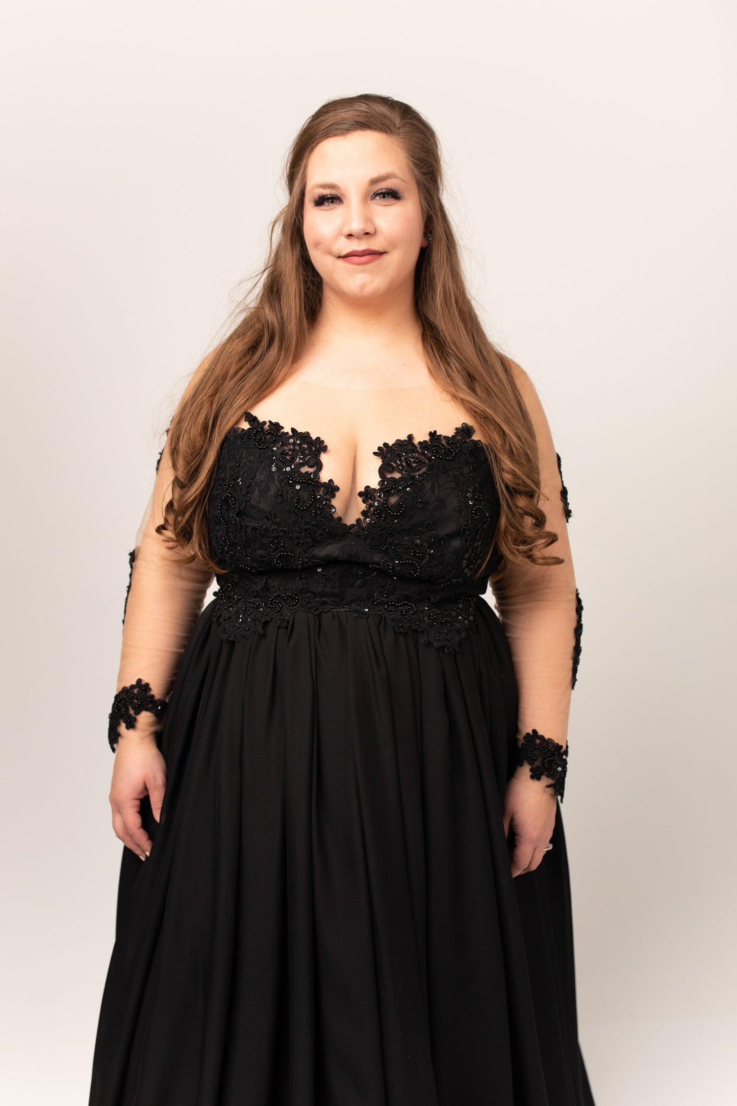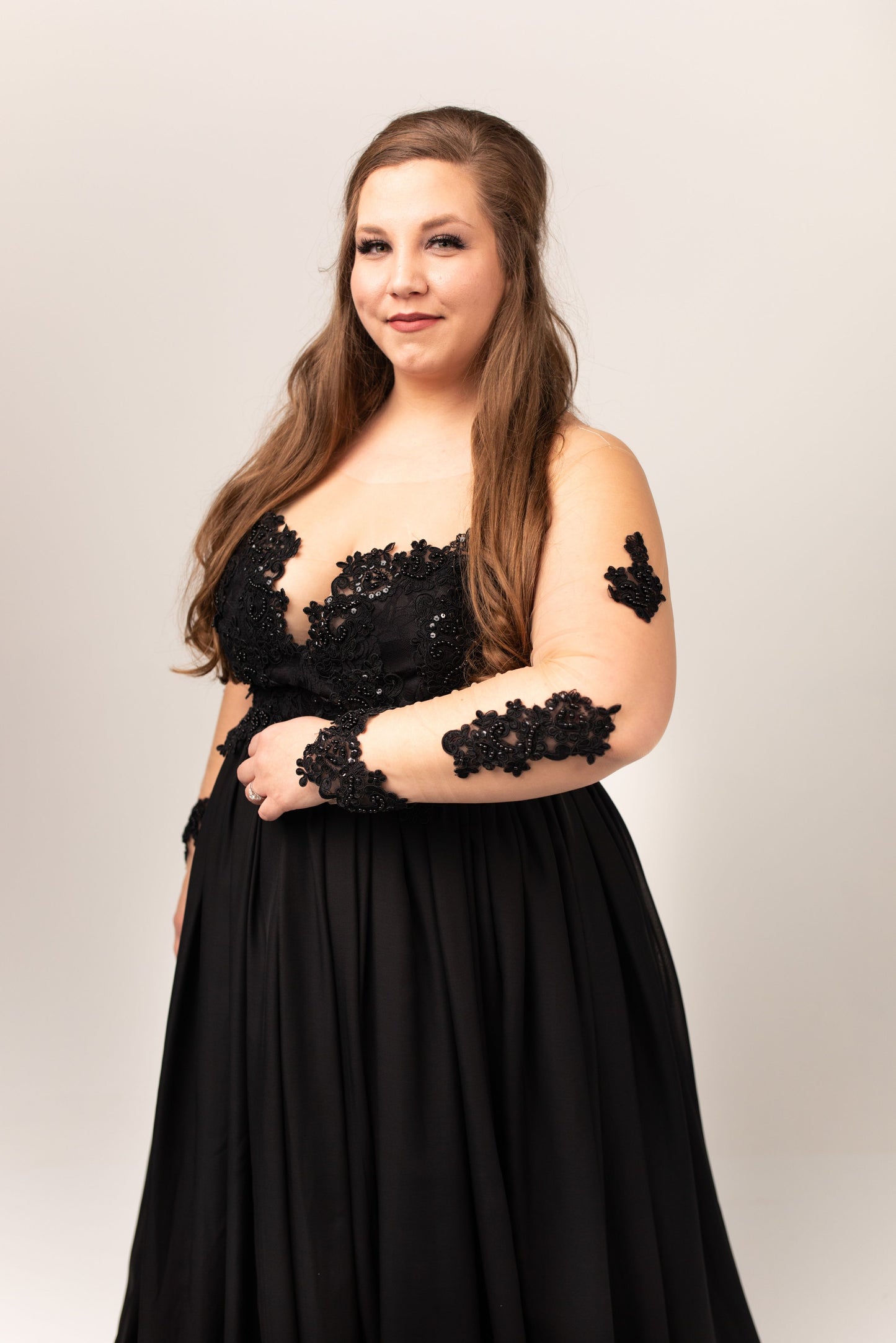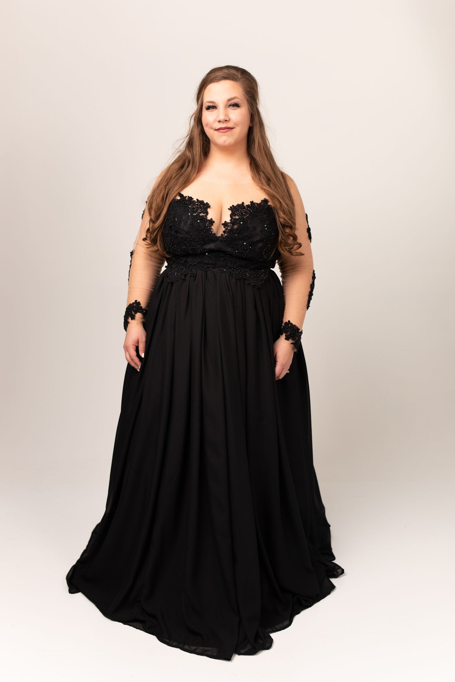 Shown with black beading/black bodice lining/black skirt lining/black chiffon/long sleeve/universal tan mesh/no train.